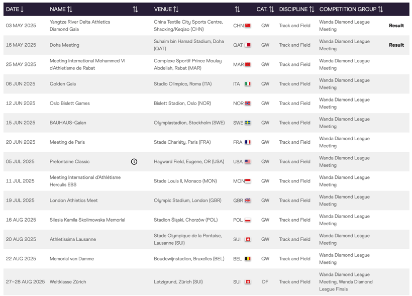 Calendrier des compétitions Diamond League 2025 :